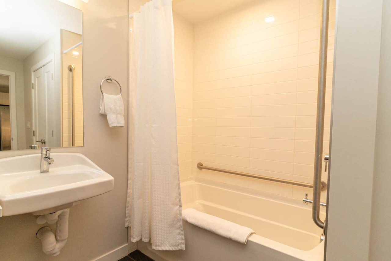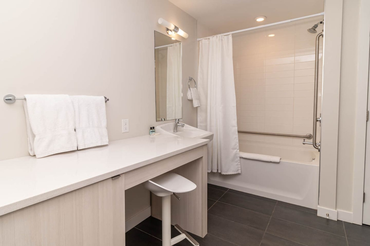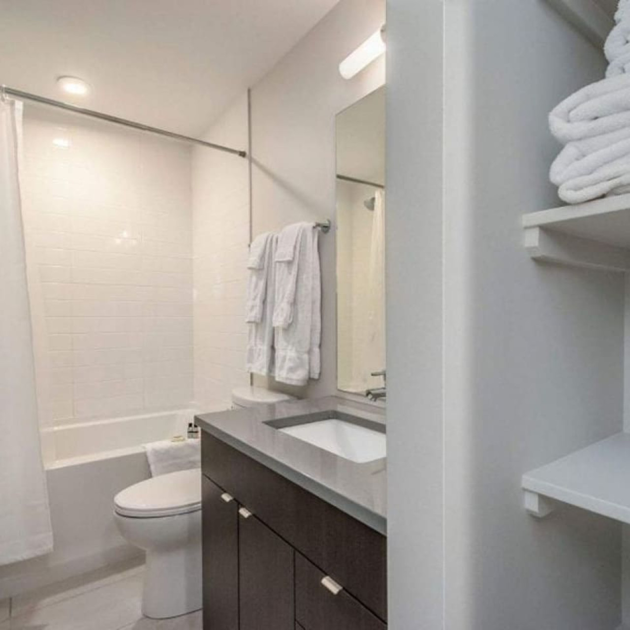 Unwind in the serene bedroom, offering spectacular skyline views. The attached modern bathroom provides a sleek vanity, plush towels, and essential toiletries, ensuring a relaxing and rejuvenating start to your day.