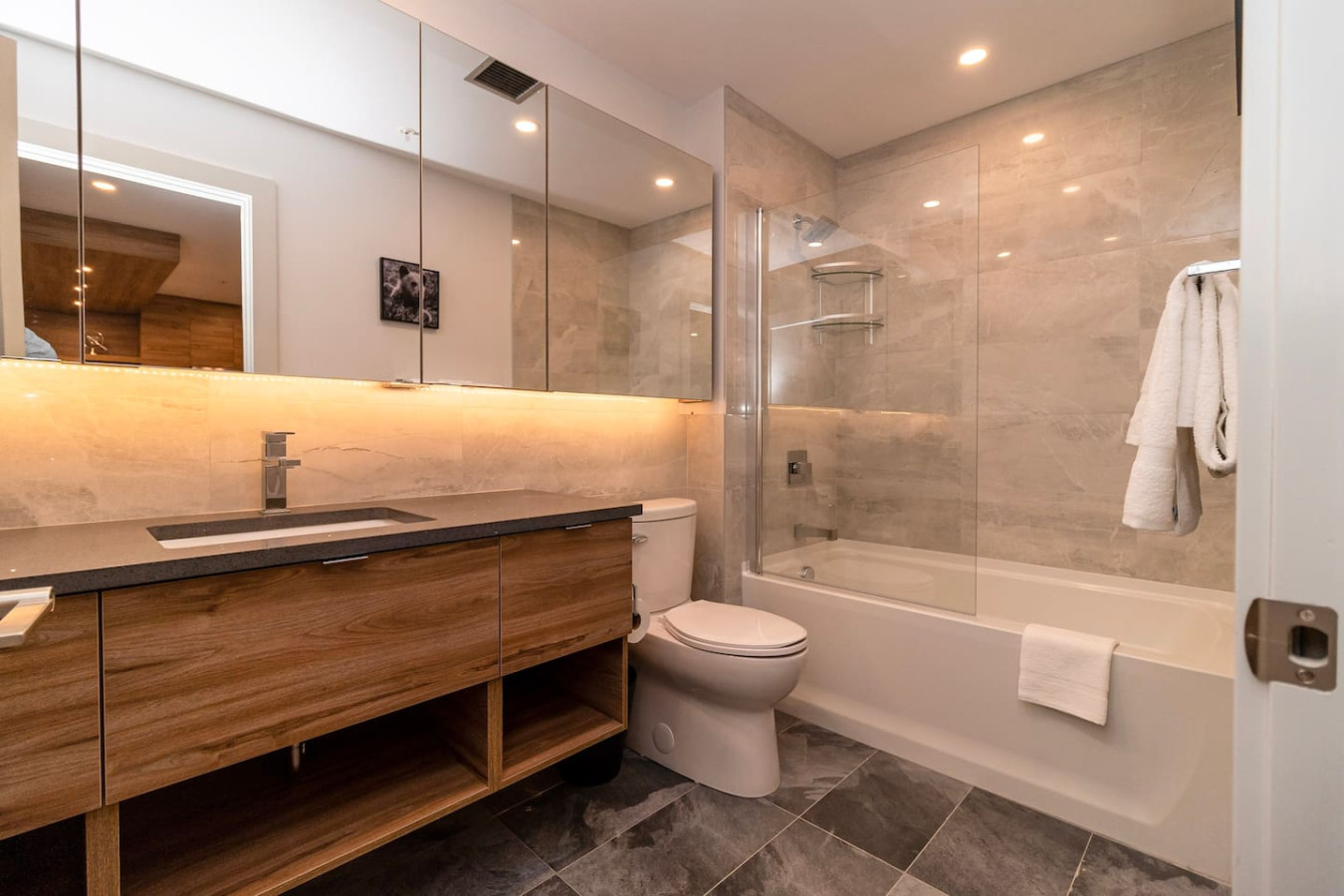 Enjoy restful nights in the one bedroom, featuring a comfortable queen-size bed and ample closet. The modern bathroom is designed for relaxation and convenience, with stylish vanities, fresh towels, and essential toiletries.