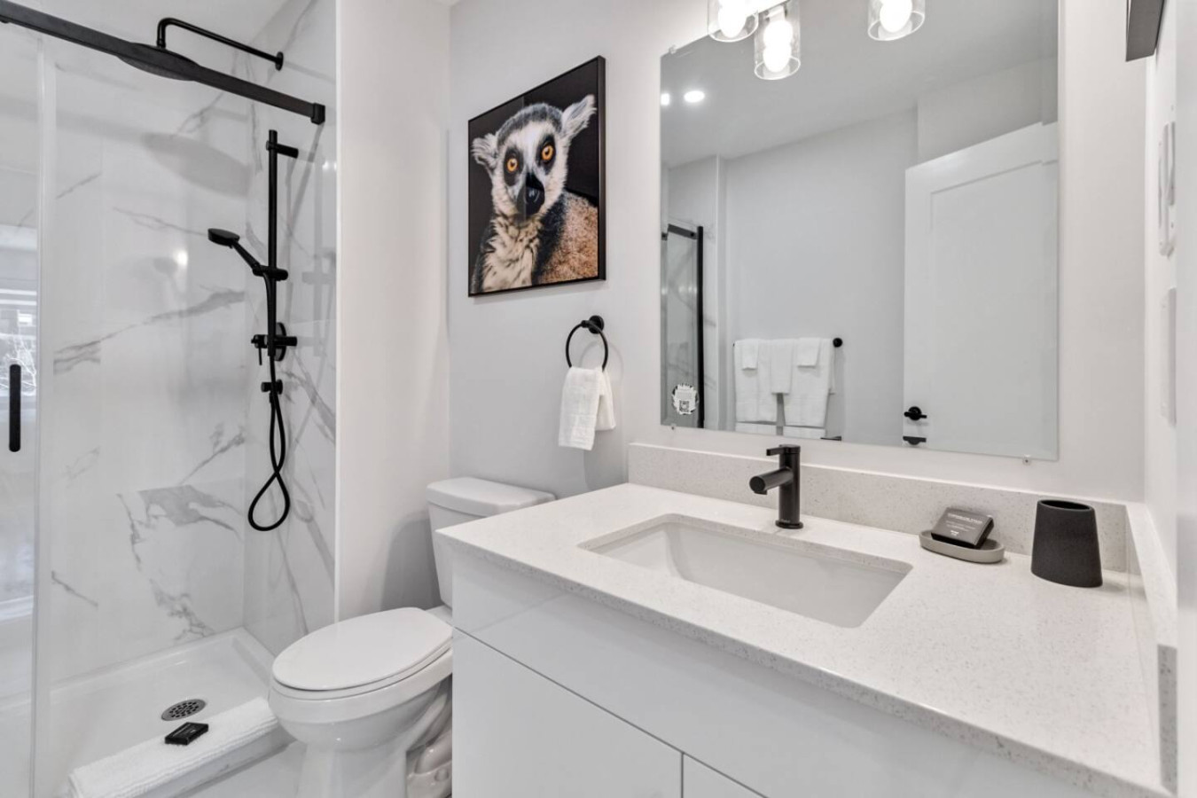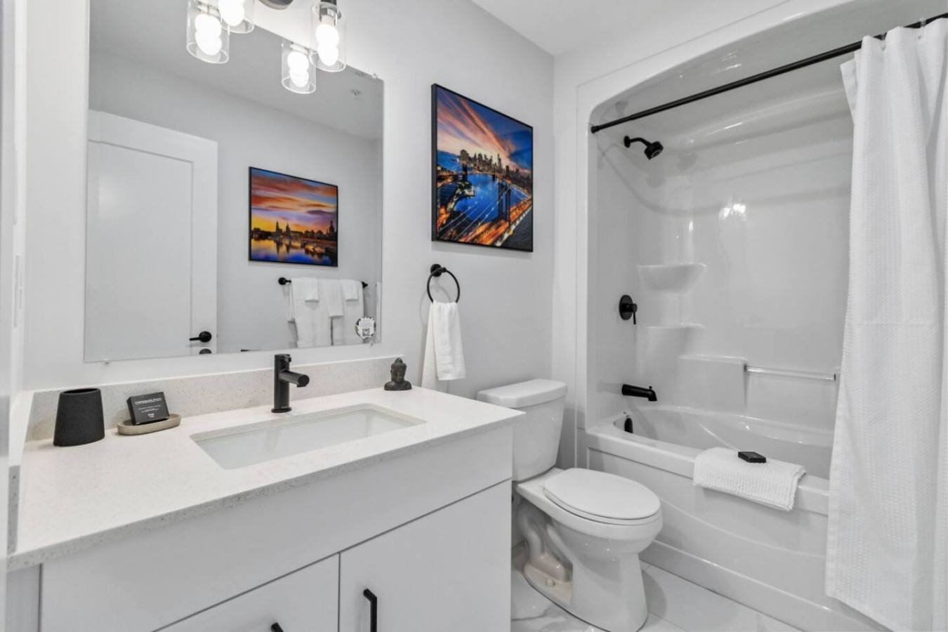 The second bathroom includes a modern bathtub and sleek fixtures, creating a relaxing environment for unwinding after a long day. Fresh towels and essential toiletries are provided in both bathrooms for your convenience.