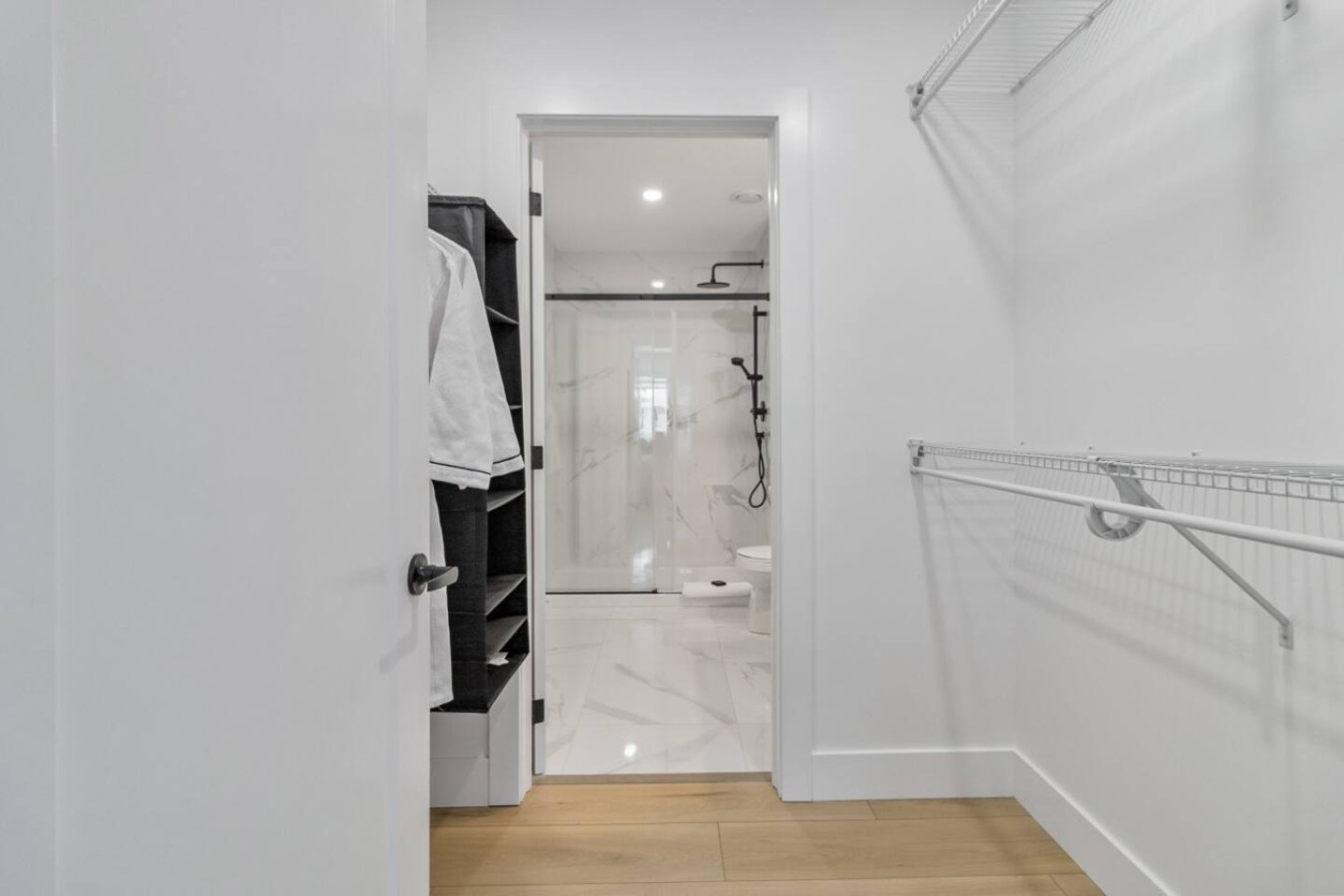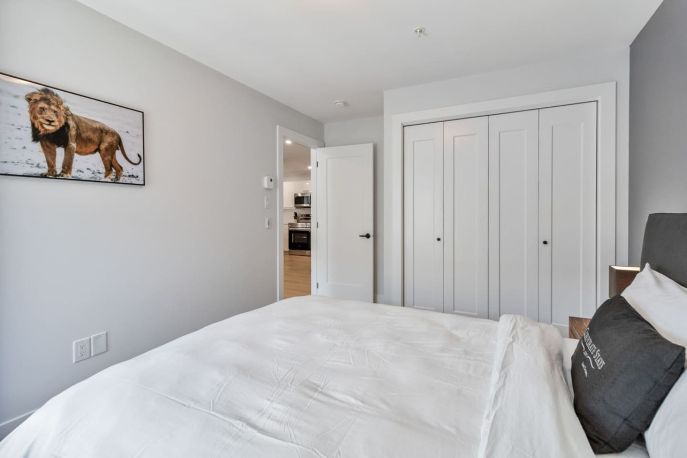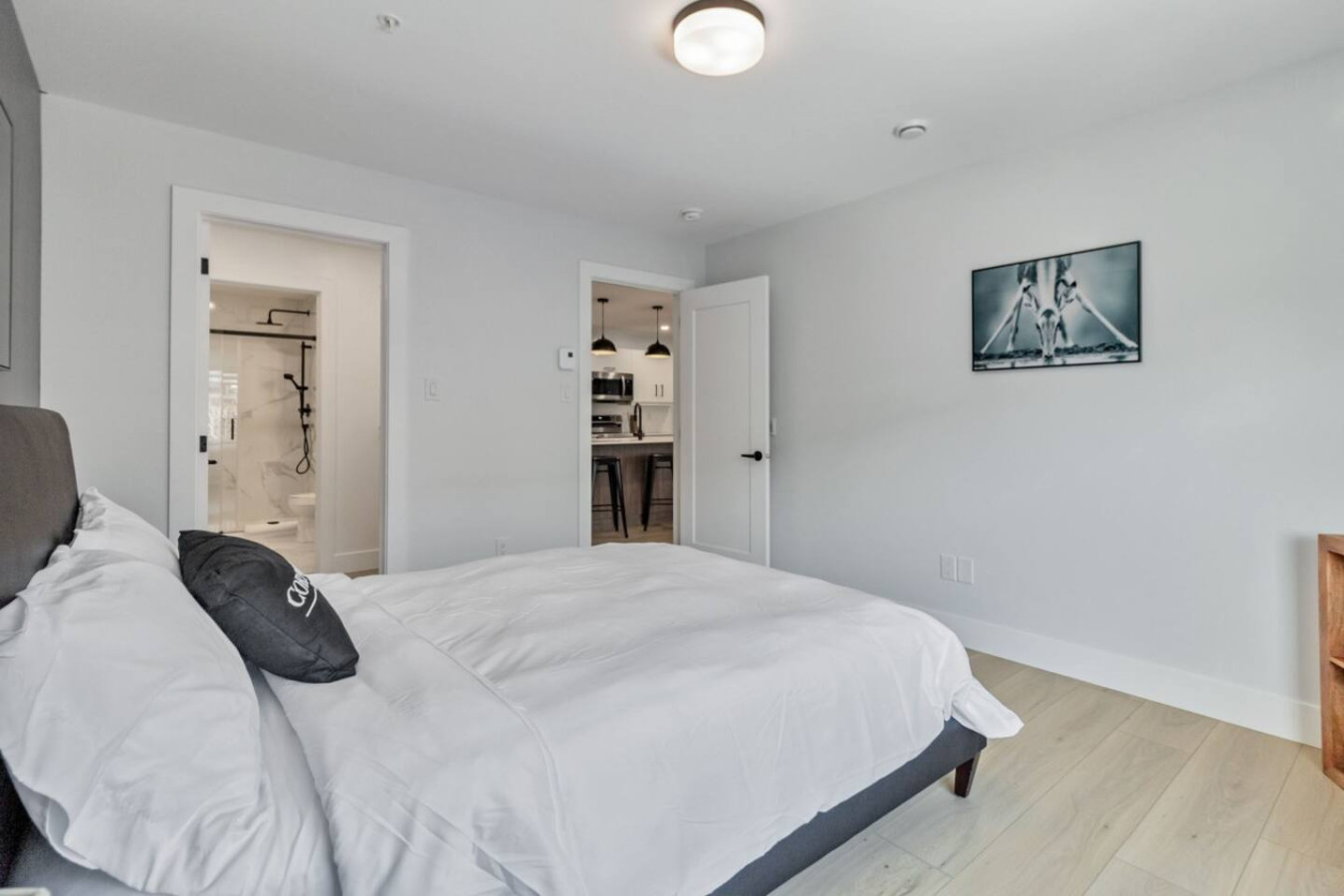 Both bedrooms feature luxurious queen-size beds and thoughtfully curated decor for ultimate relaxation. The master bedroom comes with a spacious closet and connects directly to one of the bathrooms, offering a spa-like atmosphere with a spacious shower area.
