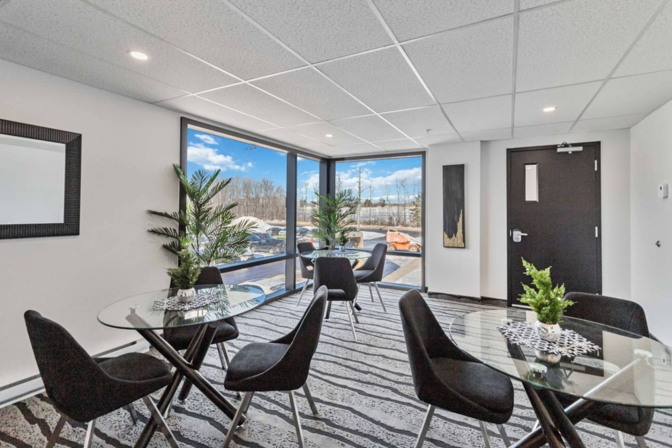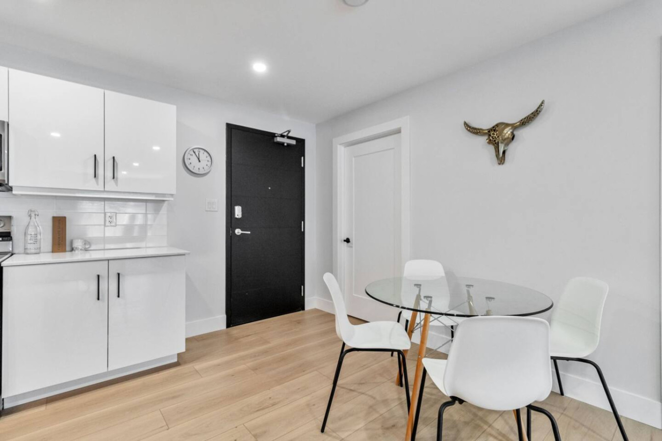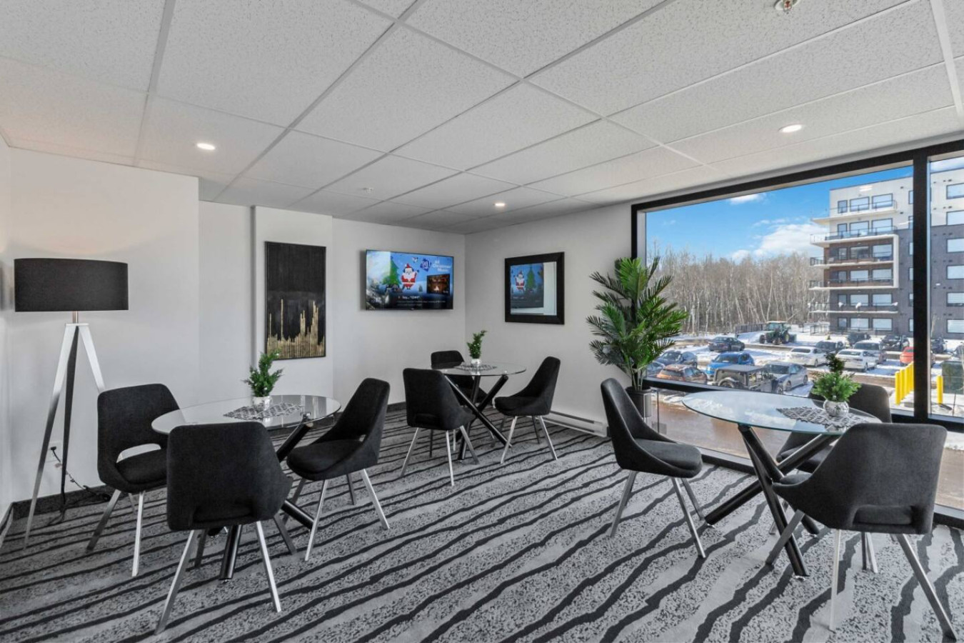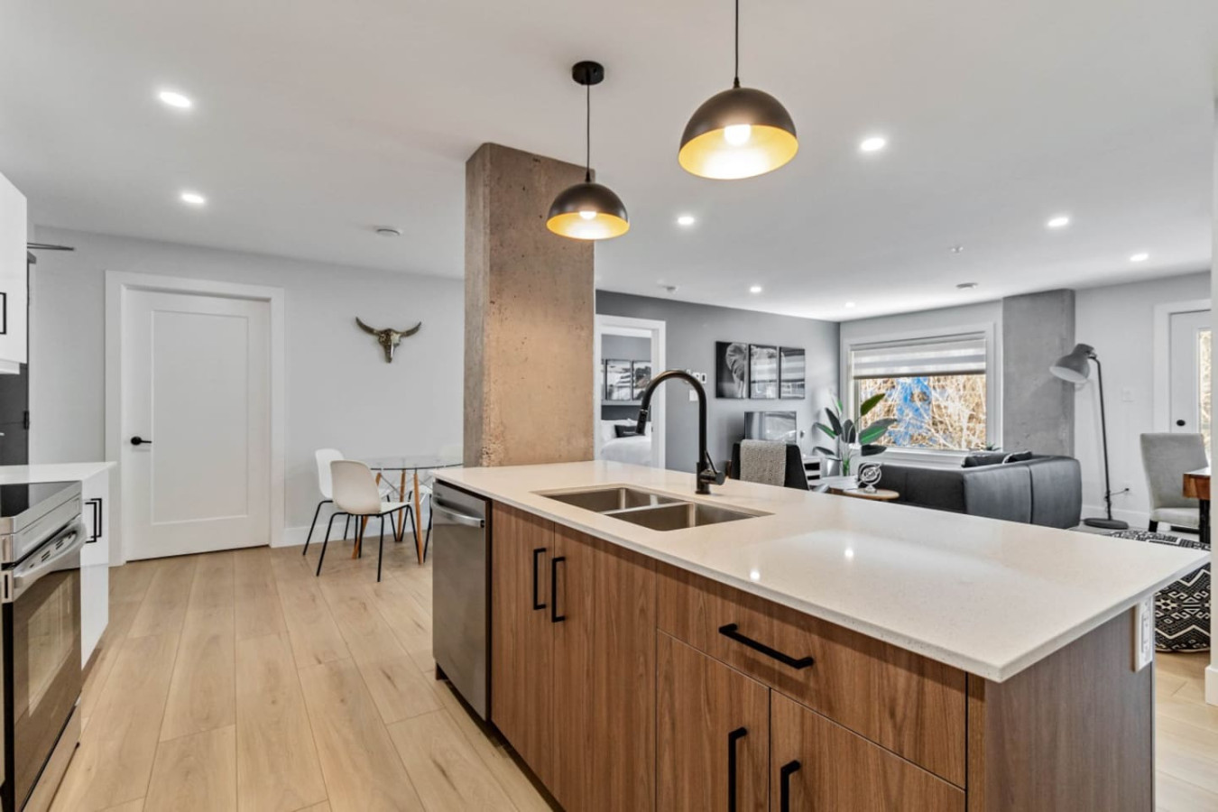 Step into a warm and inviting living room with picturesque views of Moncton’s serene Millennium Boulevard area. Relax on the plush sofa, stream your favorite shows on the Smart TV, or simply take in the calm surroundings. The open-concept design seamlessly connects the living, dining, and kitchen areas for an ideal space to unwind or entertain.