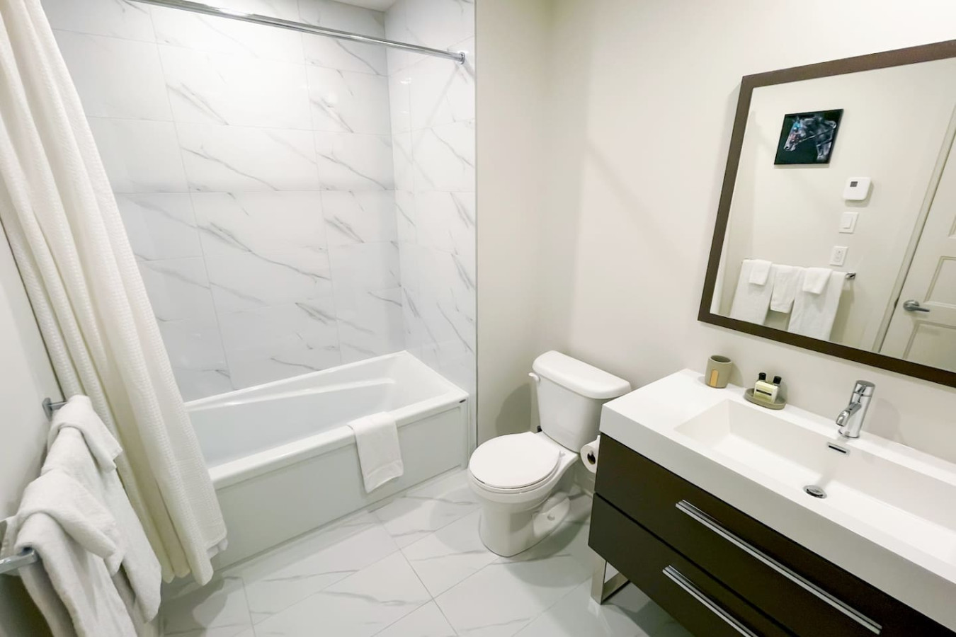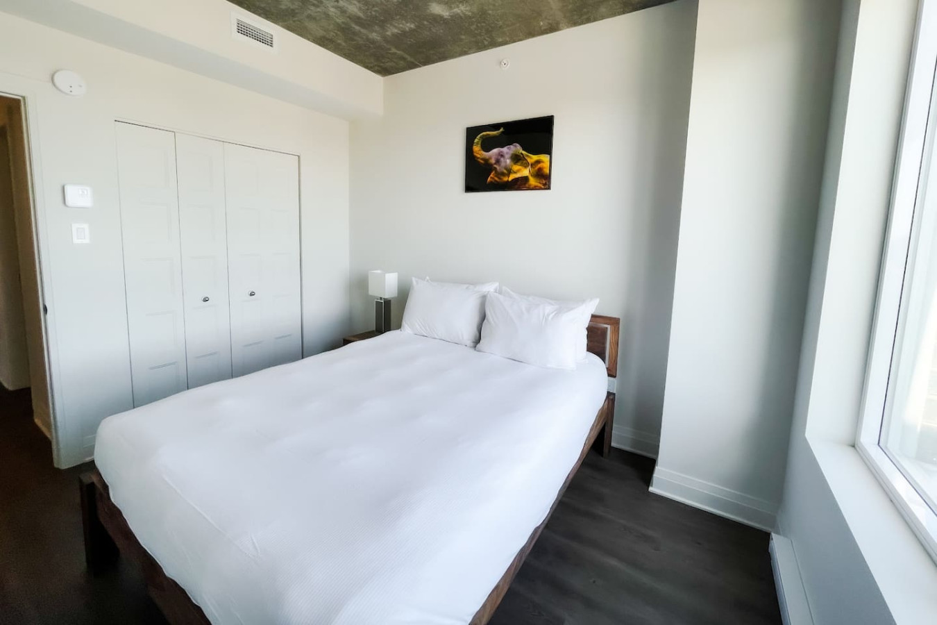 Retreat to the tranquil bedroom featuring a queen-size bed and impressive skyline views. The sleek, contemporary bathroom offers all the essentials for a rejuvenating experience.
