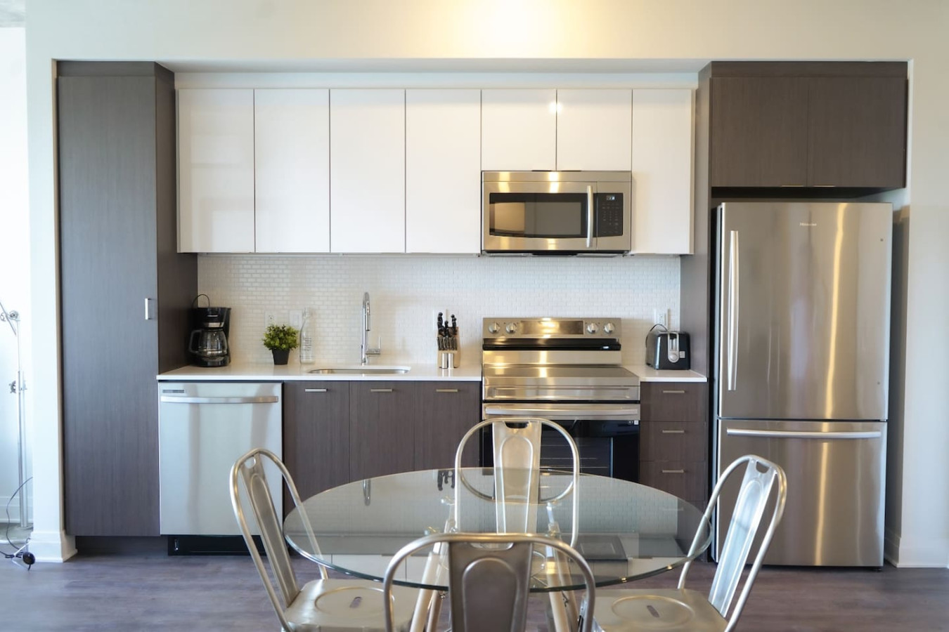 Step into a spacious and welcoming living area with panoramic views of Montreal’s skyline. Relax on the plush sofa, enjoy your favorite shows on the Smart TV, or simply unwind while taking in the stunning cityscape.