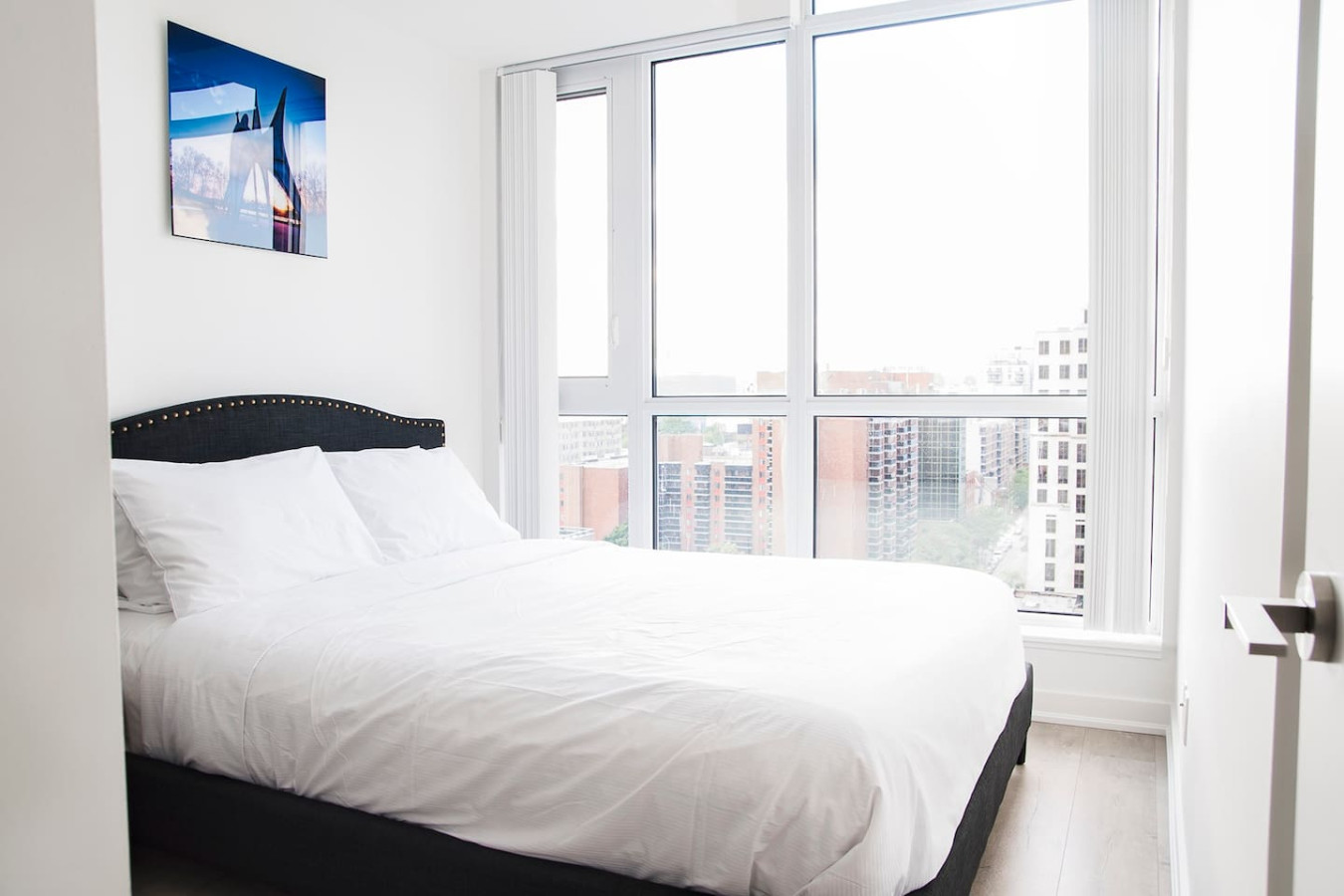 Indulge in a restful haven designed for relaxation. The primary bedroom features floor-to-ceiling skyline views, a cozy queen-size bed dressed in premium linens, and a spacious closet to keep everything organized.
