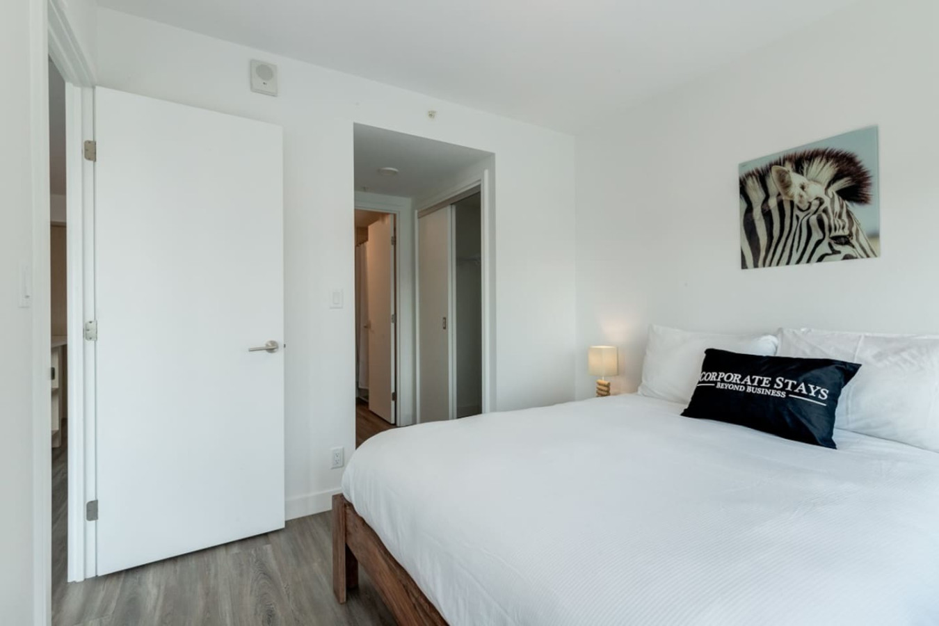 Escape to the spacious, luxurious bedroom that showcases skyline views and a cozy queen bed for a restful night’s sleep. Complete with stylish nightstands and a roomy wardrobe, plus a convenient private laundry area linked to your bathroom, comfort is prioritized. The contemporary bathroom features a stylish vanity and a walk-in shower (with some units offering a bathtub), complemented by fresh towels, toiletries, and a hairdryer to enhance your experience.