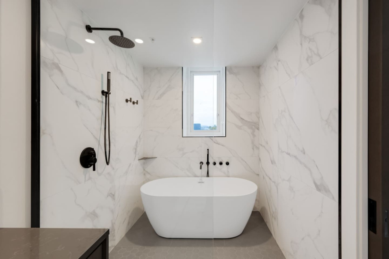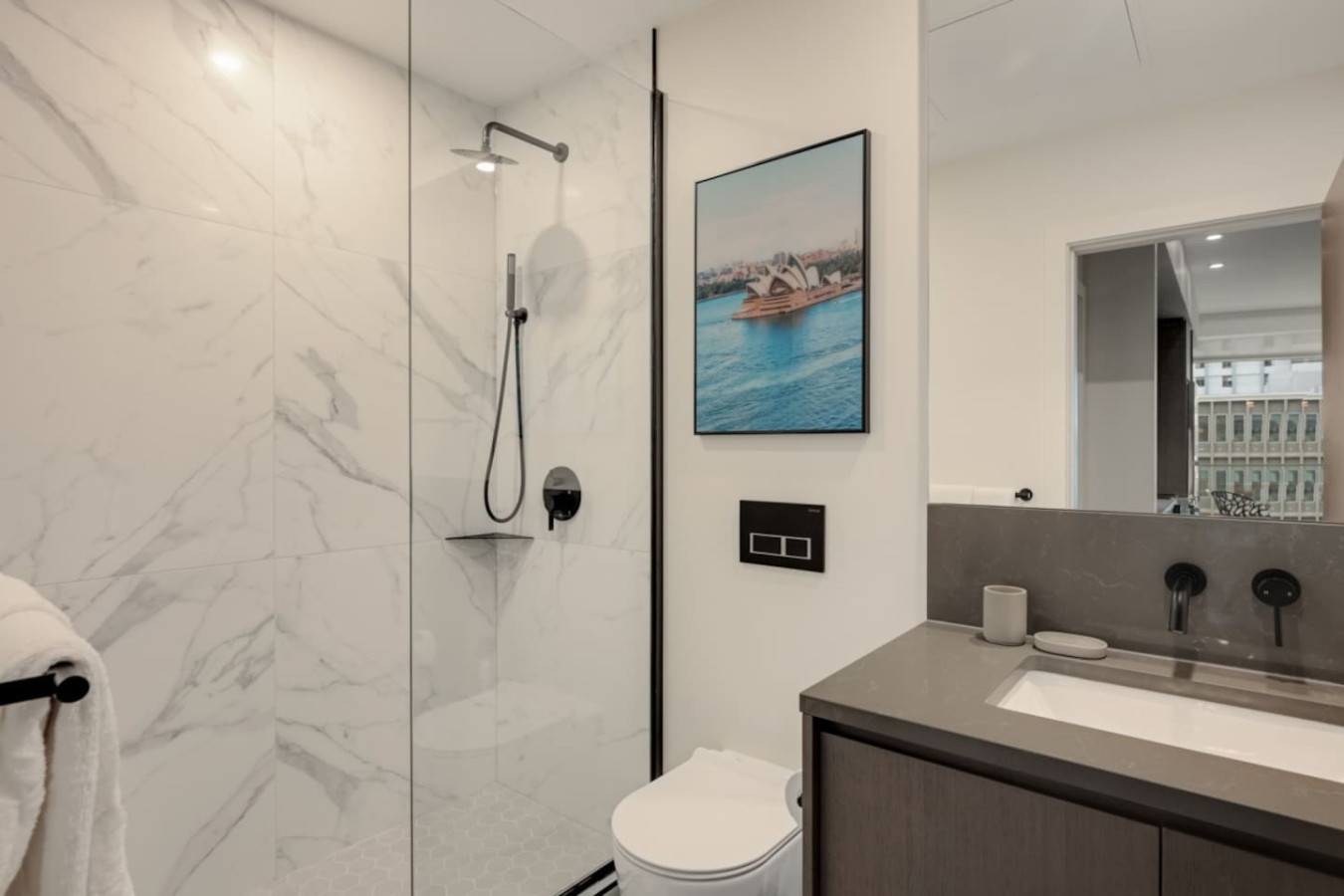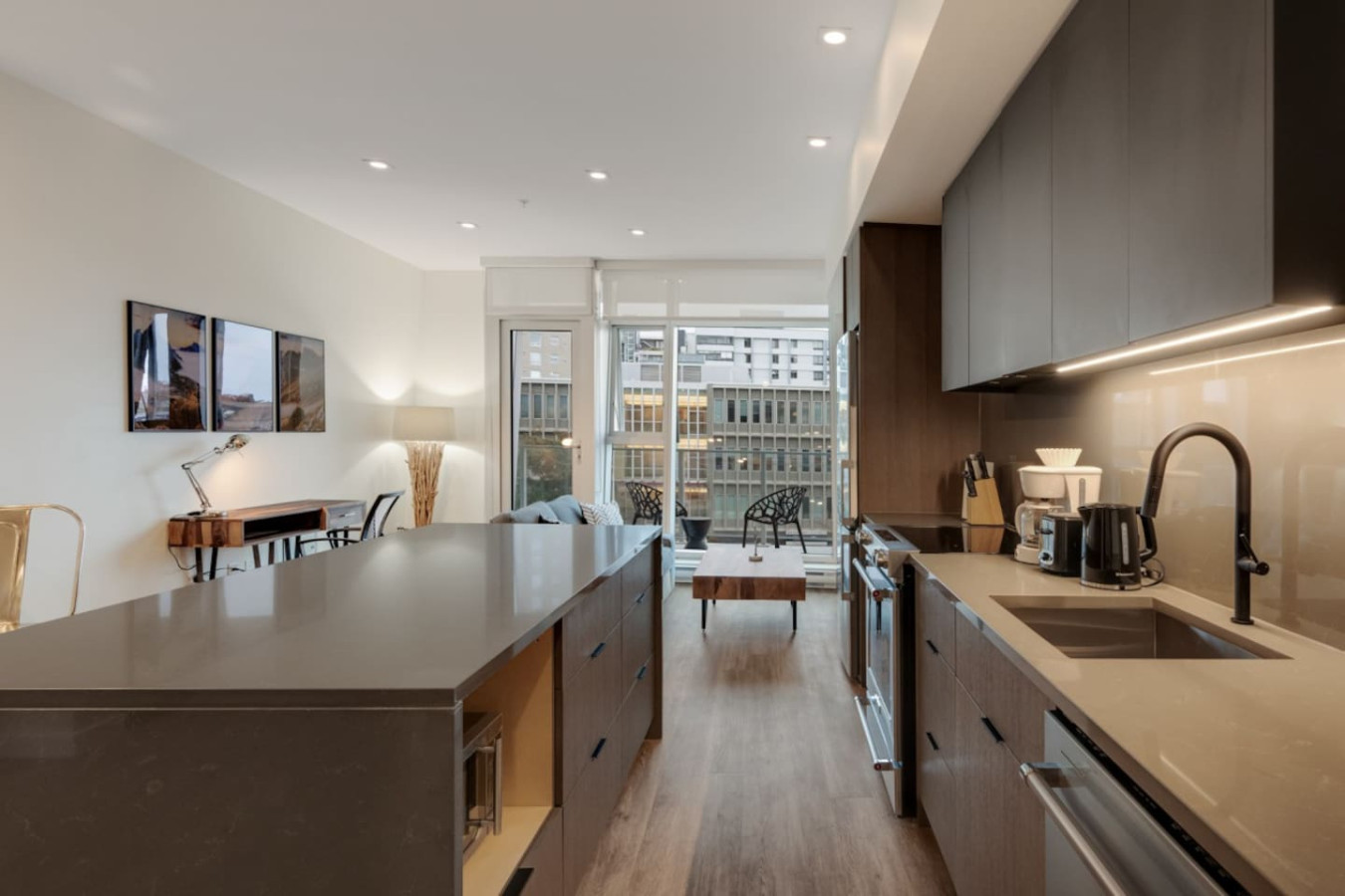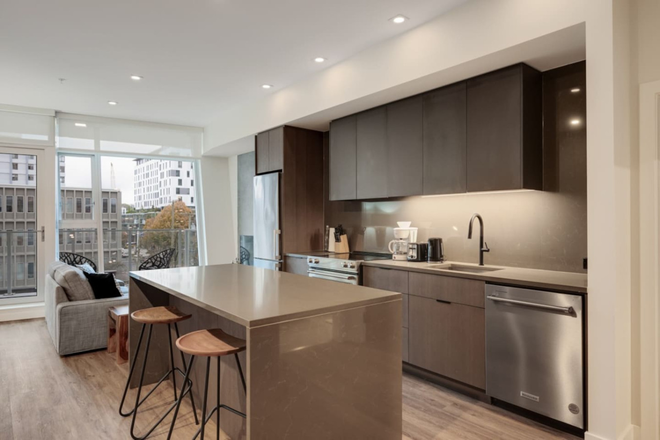 Step into a spacious and inviting living area with picturesque views of Victoria’s Harris Green district. Enjoy relaxing on the plush sofa, streaming your favorite shows on the Smart TV, or unwinding in the serene, well-lit ambiance of this carefully designed space.