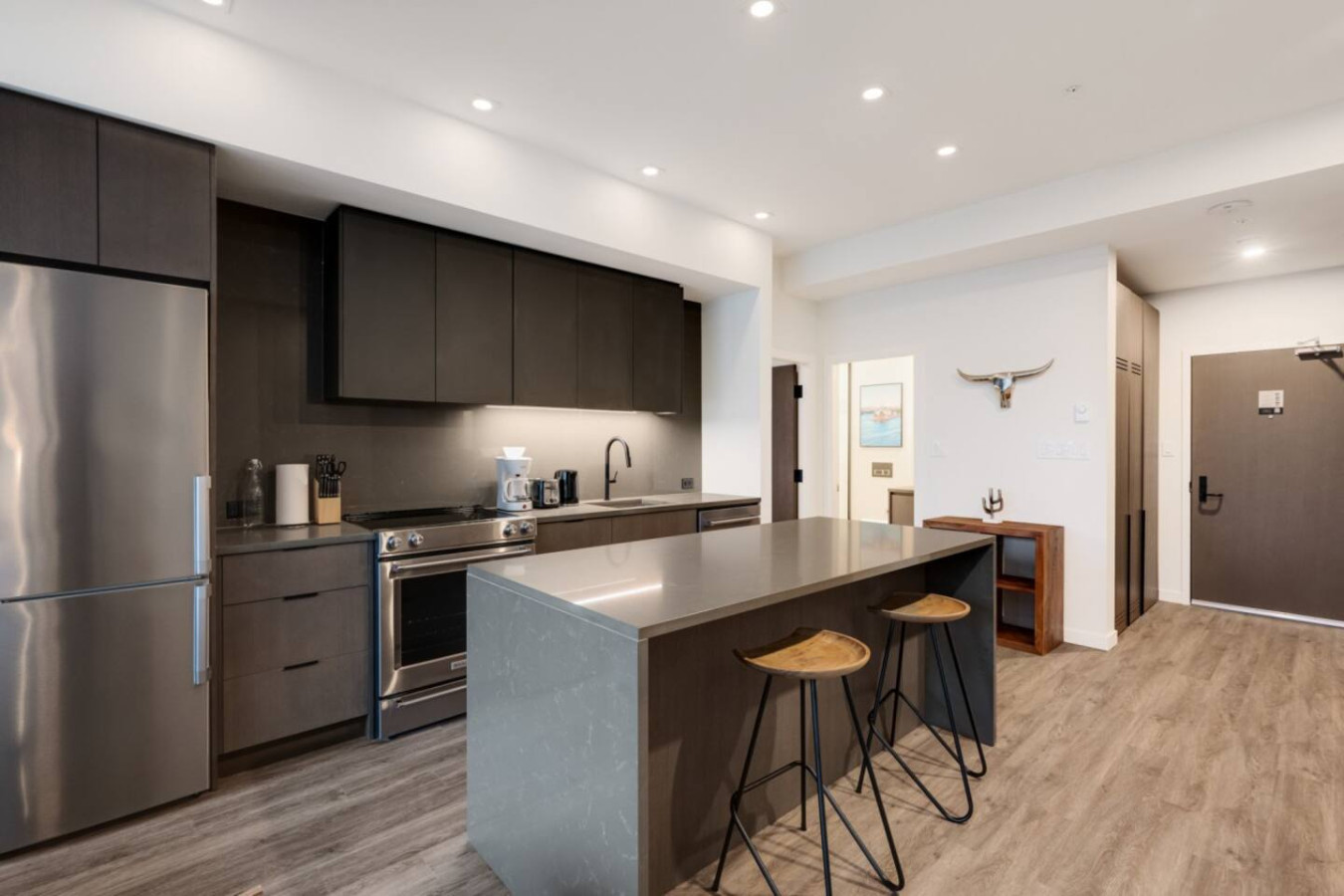 Unleash your culinary creativity in the sleek, modern kitchen, fully equipped with ample counter space and premium appliances. Whether preparing a quick snack or a gourmet meal, this kitchen caters to all your needs.