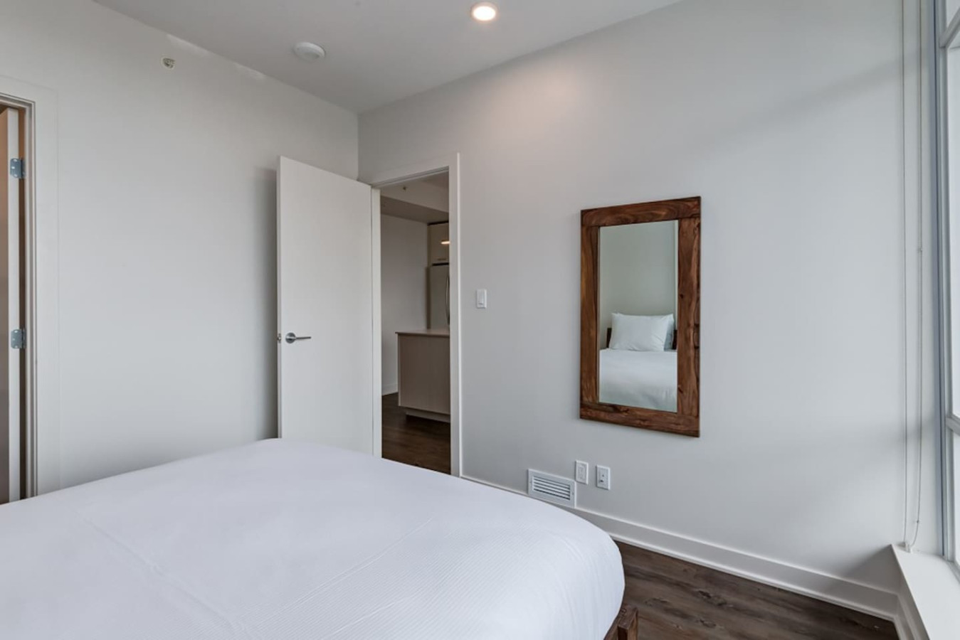 This apartment boasts a luxurious bedroom thoughtfully designed for comfort and functionality, with breathtaking skyline views that create a serene atmosphere. The spacious layout includes a sumptuous queen-size bed, two chic nightstands, and a generous closet to hold all your belongings. The large window bathes the room in natural light while inviting you to relax and enjoy the cityscape.
