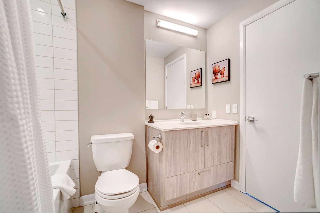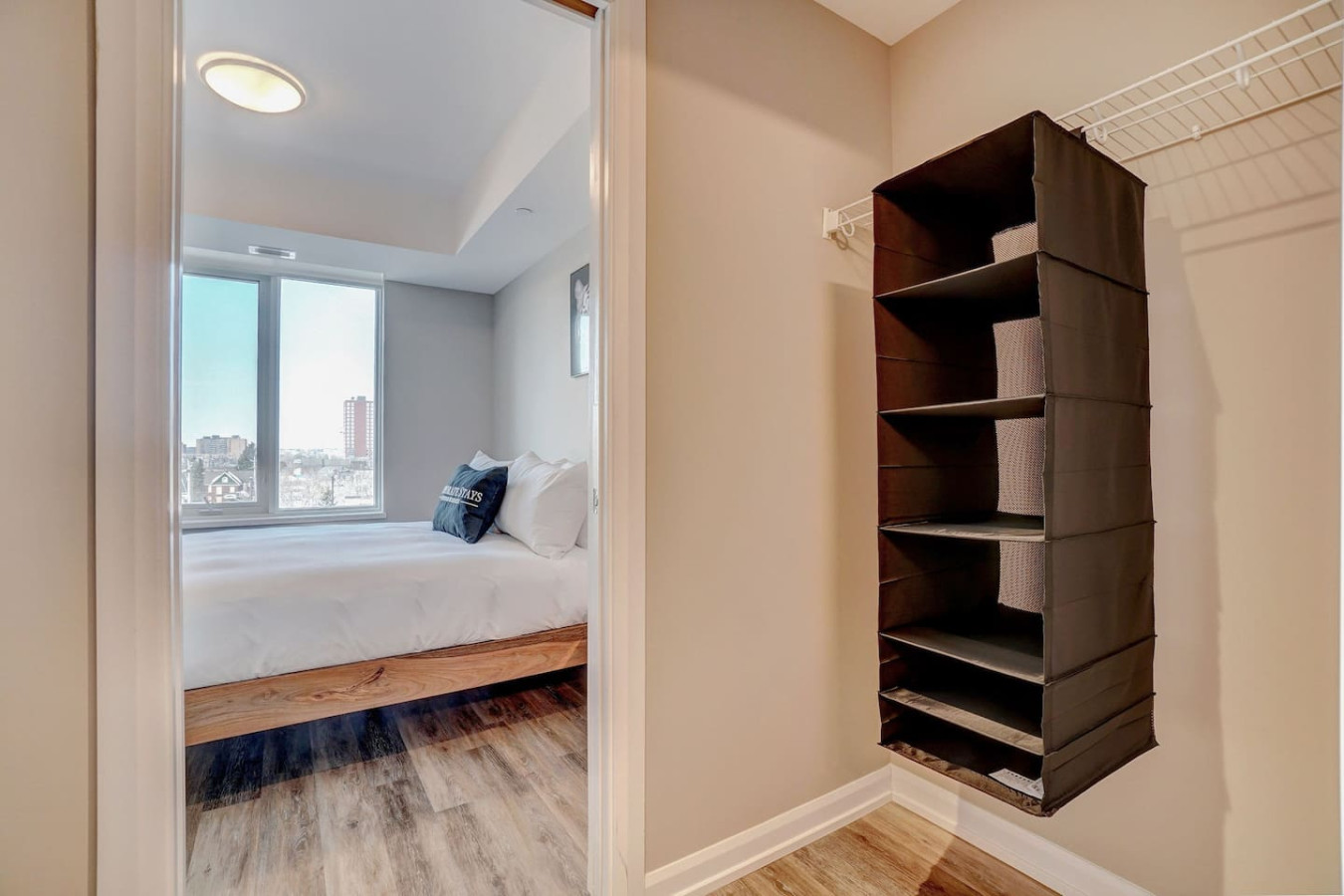 Relax in the generously sized bedroom, thoughtfully styled for ultimate comfort. The luxurious Queen-size bed is complemented by elegant nightstands and a large window, framing beautiful skyline views. The bathroom exudes sophistication, featuring a stylish vanity, a sleek glass-door shower or bathtub, and fresh towels and premium toiletries.
