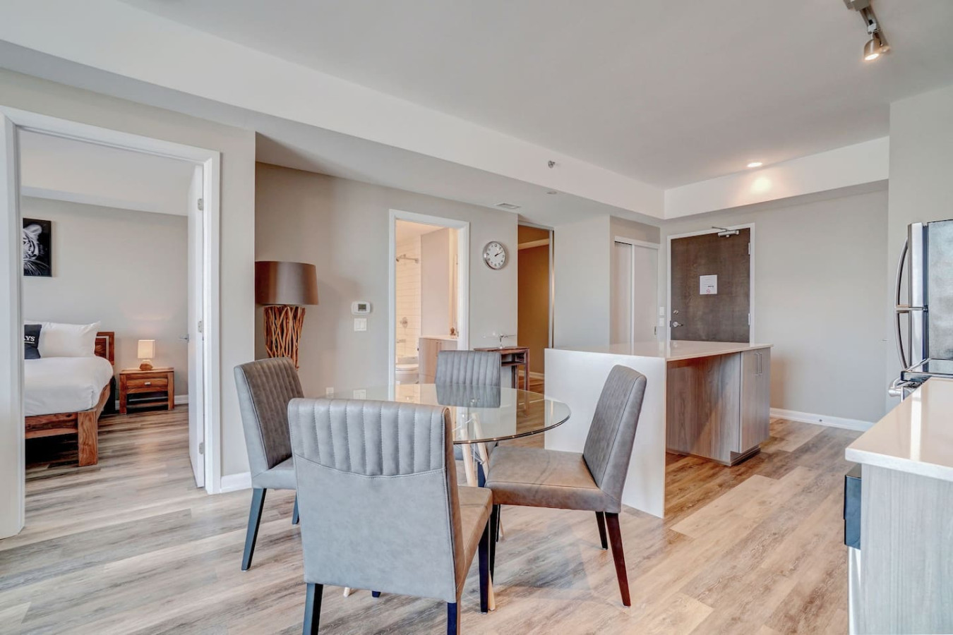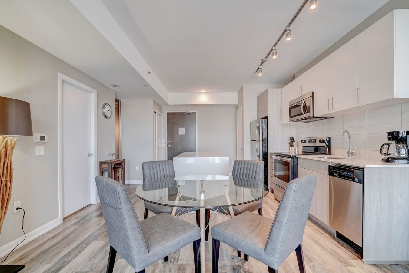 Step into a spacious and bright living room designed to be your serene urban retreat. Elegantly furnished with a comfortable sofa, chic floor lamp, and a large Smart TV, this space is perfect for relaxation after a day of exploring Ottawa. The warm-lit dining area comfortably seats four, creating an inviting atmosphere for shared meals and conversations.