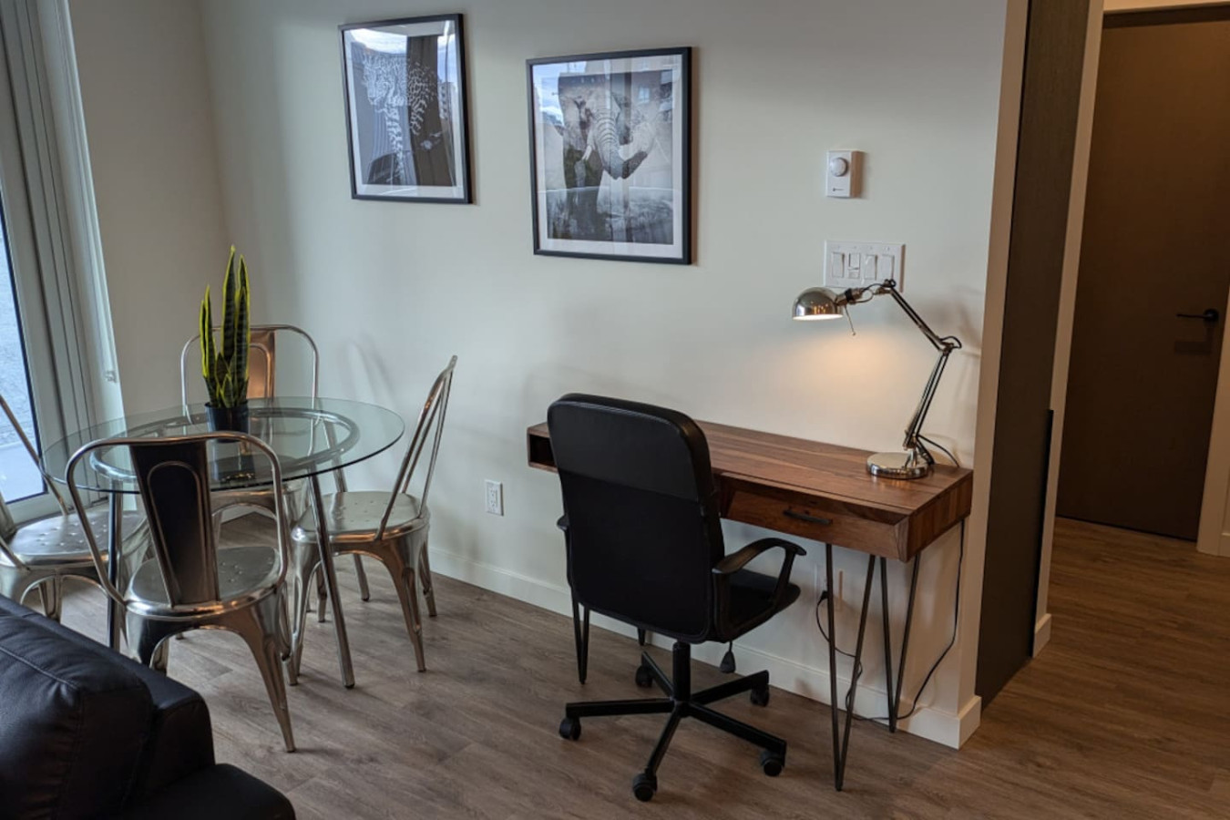 Step into a spacious and inviting living area with picturesque views of Victoria’s Harris Green district. Enjoy relaxing on the plush sofa, streaming your favorite shows on the Smart TV, or unwinding in the serene, well-lit ambiance of this carefully designed space.