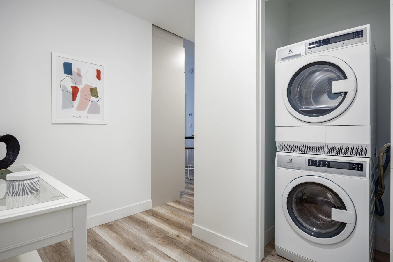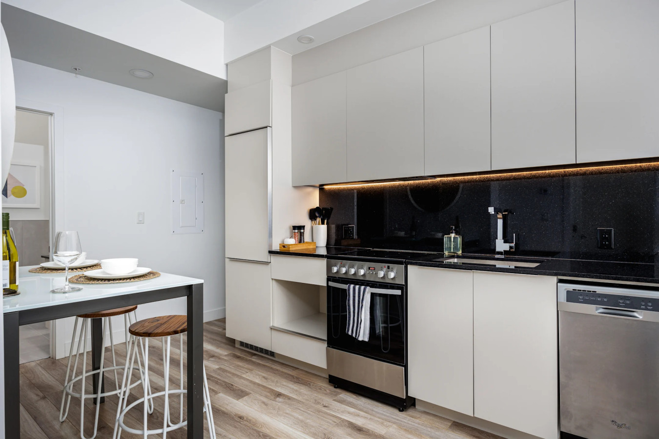 Each apartment features six premium appliances: fridge, stove, dishwasher, microwave, and in-suite washer/dryer.